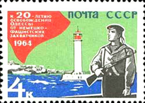 On the 1964 Soviet Union stamp above, behind the sailor with a gun is the lighthouse of the port of Odessa. The text on the stamp reads: “20th anniversary of liberation of Odessa from Nazi invaders”.