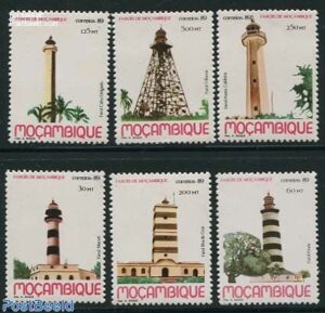 A six-stamp 1989 set from Mozambique above. It features (left to right) the Cabo Delgado, Vilhena, Ponta Caldeira, Macuti, Ilha de Goa and Pinda lighthouses.
