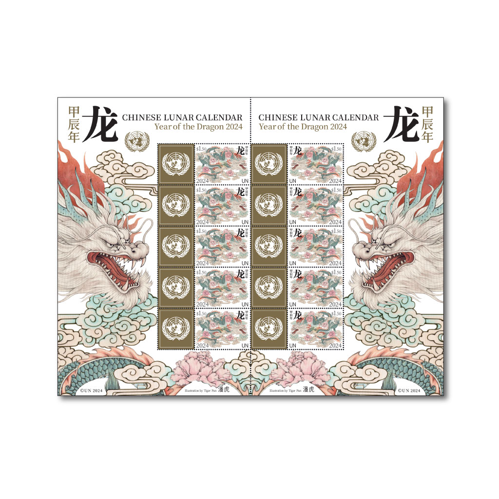 On 19 January 2024, the United Nations Postal Administration (UNPA) celebrated the Year of the Dragon with the above special 10-stamp sheet.