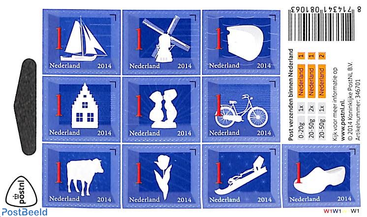 The designs were hand drawn by artist Sanny van Loon. The illustrations are in the middle of the stamps, against a background with diamonds or stripes in different shades of turquoise. On the stamps above the destination International has been added to the left side of the stamp. The stamps for domestic use have a gold-yellow perforated border. The border of the International stamps is dark blue. These are the successors to the white-blue 3D icons stamps seen below, which have been in use since 2014.