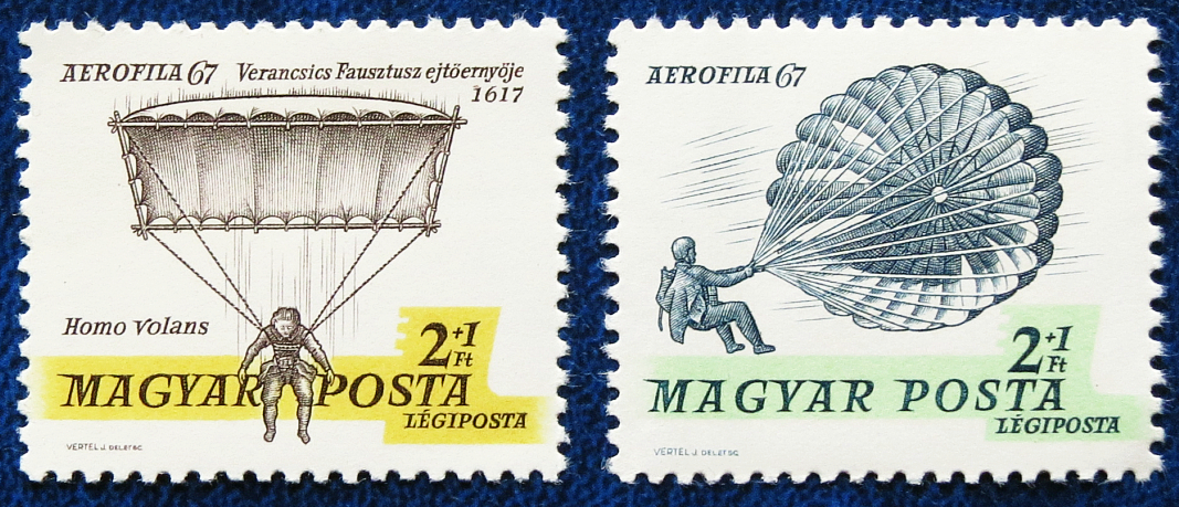 The ‘Homo Volans’ (Flying Man) parachute was invented by Fausto Veranzio (1551-1617), a Dalmatian philosopher, historian and inventor. It is shown on the Hungary stamp pair seen above.