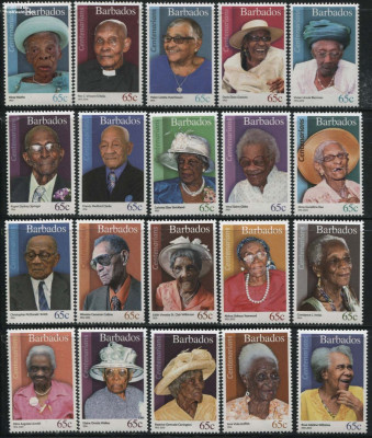 The 27 centenarian stamps feature portraits of some “Bajans” who have died and others who are still alive. Twenty of the stamps feature people who were 100 years old at the time of printing, while the remaining seven feature “semi-super centenarians,” who are between 105 and 109 years old, and “super centenarians” who are, amazingly, 110 years or more.